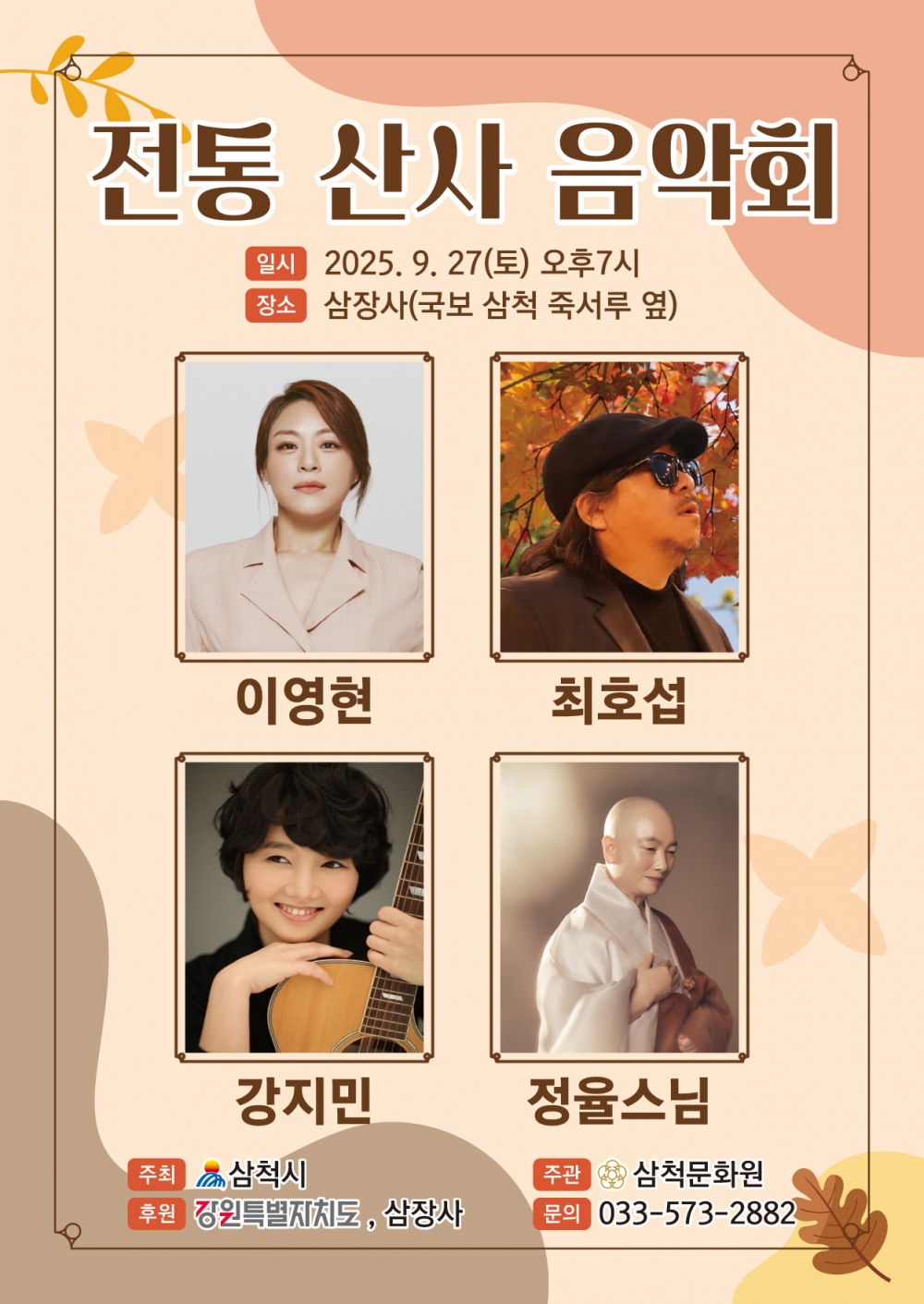 ★ 신라 말에 창건한 오랜 전통을 자랑하는 삼척의 대표 사찰인 삼장사에서 산사음악회를 개최하여, 시민과 관광객들께 특별한 경험을 제공하고 지역 문화유산이 가진 역사적·문화적 가치를 홍보할 기회를 제공페이지 정보