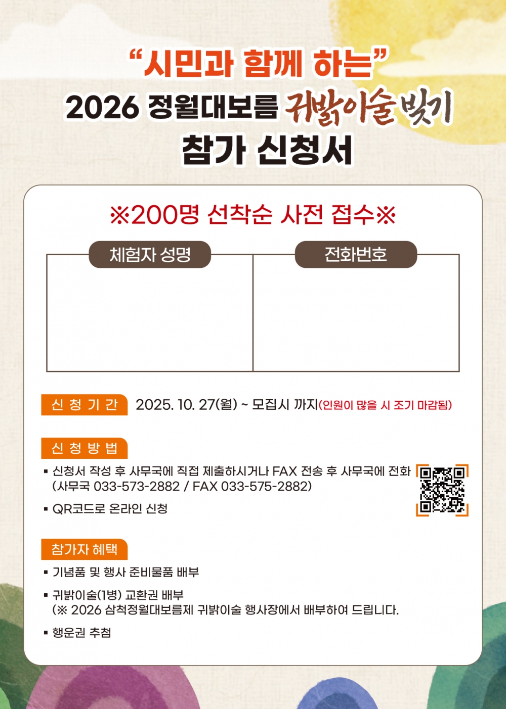 정월대보름 세시풍속인 귀밝이술 빚기 체험에 삼척 시민 200명을 선착순으로 모집합니다. 가족의 평안과 무병을 기원하는 2026년 정월대보름 귀밝이술 빚기 행사에 시민 여러분의 많은 참여 바랍니다.페이지 정보